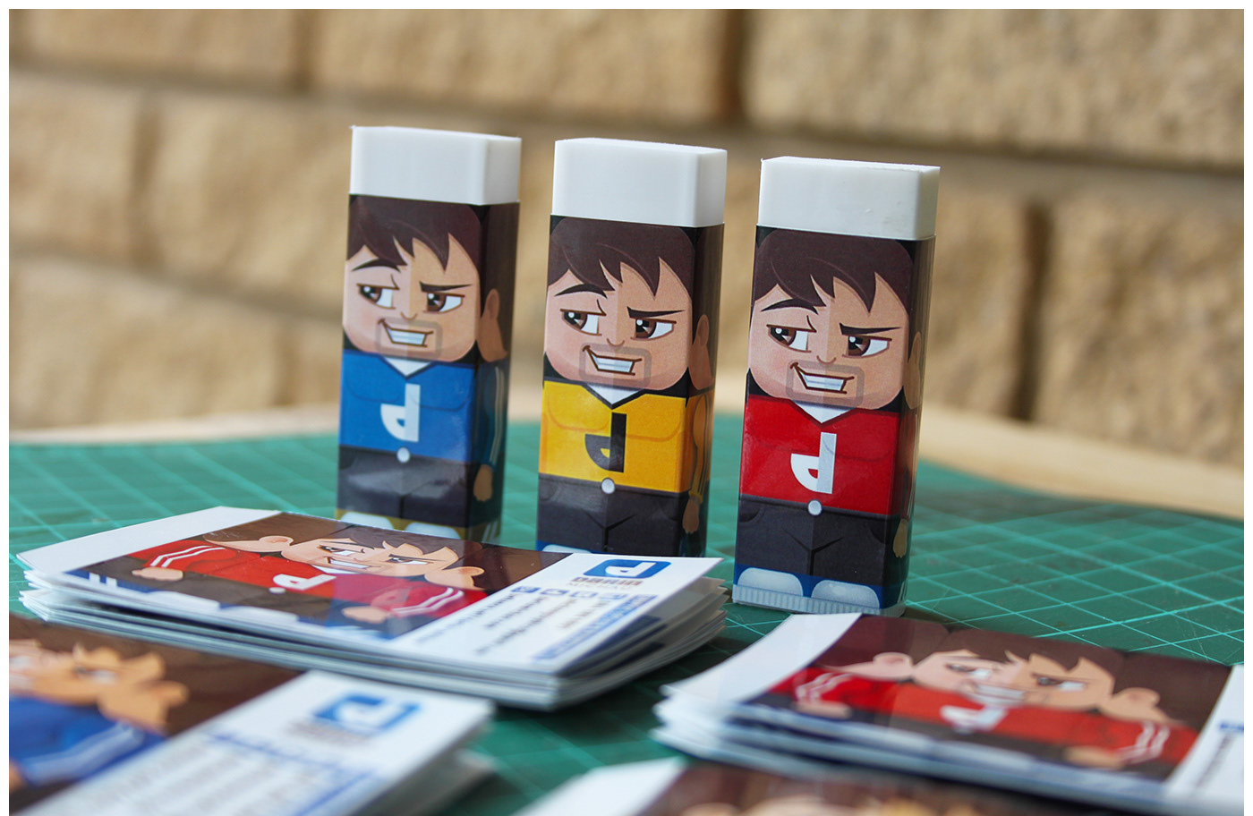 I created this eraser business card to be something useful, instead of a standard business card, which is sometimes quickly discarded. I made a small army of these guys to promote my business in my home town. Below is a pencil sketch that I started with, followed by a series of photos of the little character business card.